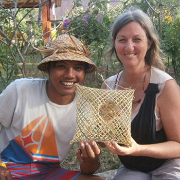 Kim has been weaving for over twenty years and shares her knowledge of local and introduced fibre harvest, preparation and use, coil and wrap techniques, rattan and vine basketry, twining, cordage, random weave, natural dyes and more with warmth and patience.